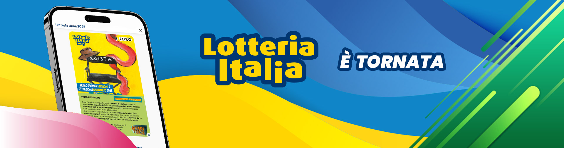 Se sei un appassionato delle Lotterie, con Sisal hai una scelta davvero ricca: puoi tentare la fortuna giocando al classico gioco del Lotto, ma anche al 10eLotto, al SuperEnalotto anche in modalità SiVinceTutto o al MillionDay. Con l'offerta delle lotterie online di Sisal.it si può anche vincere una casa da sogno con VinciCasa, aggiudicarsi una rendita per la vita al WinForLife o divertirsi con i nuovi Gratta e Vinci.